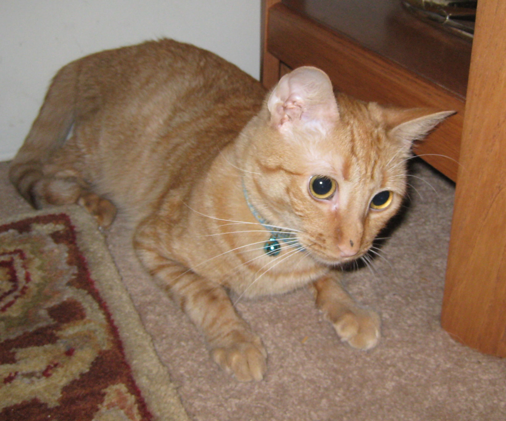 Moving on down, this little orange beast is Schrodinger. Yes, I have a cat named Schrodinger. If you don’t get the reference, look it up on Wikipedia. Schrodinger has a very special place in our hearts because, well, we rescued him. One of my mother’s coworkers found him near her house, surrounded by the bodies of his litter mates. The mother had either abandoned them or been scared off (or eaten), and the only survivor was this tiny, malnourished little orange fleebag. We brought him home, spent 3 hours picking flees off of him, and raised him to be the pointy orange kitten we know and love today.